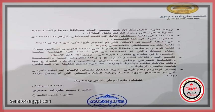حرصا من النائب محمد علي ابو حجازي علي ايصال صوت وطلبات المجتمع الدمياطي فقد تقدم النائب محمد علي ابو حجازي بعدة طلبات للسيد رئيس الوزراء الدكتور مصطفي مدبولي اثناء لقاءه به اليوم و زيارته لمحافظة دمياط تطرق فيها لعدة ملفات في ( الصناعة – التجارة – الصيد – الطرق والمواصلات – السياحة – التعليم – الصحة ) والتي تمس الشارع الدمياطي