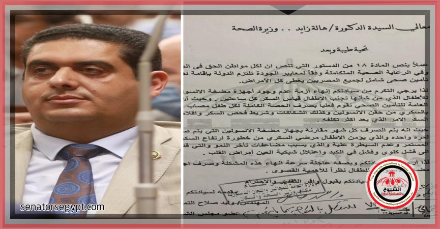 النائب وليد التمامي يتقدم بإقتراح لوزيرة الصحة لحل مشكلةعلاج الأطفال مرضي السكر والصحة تستجيب